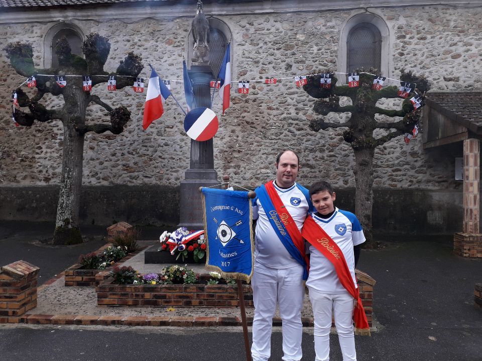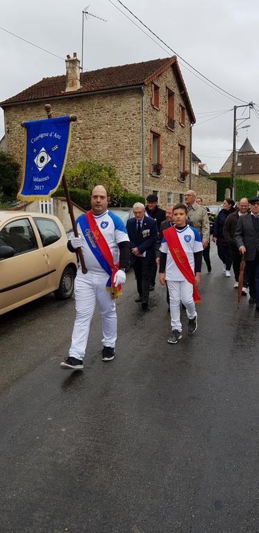 Il y a 100 ans, la cloche de l'église Saint Elois retentissait 11 fois pour annoncer la fin des combats. En ce 11 novembre 2018, c'est après 11 tintements de cloche que la comémoration du 11 novembre débutait. Pour la première fois depuis sa renaissance, notre compagnie d'arc rendait les honneurs à nos morts pour la France en présentant, comme de tradition, notre drapeau.