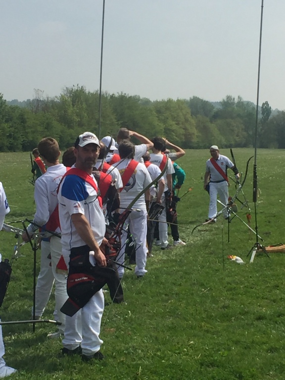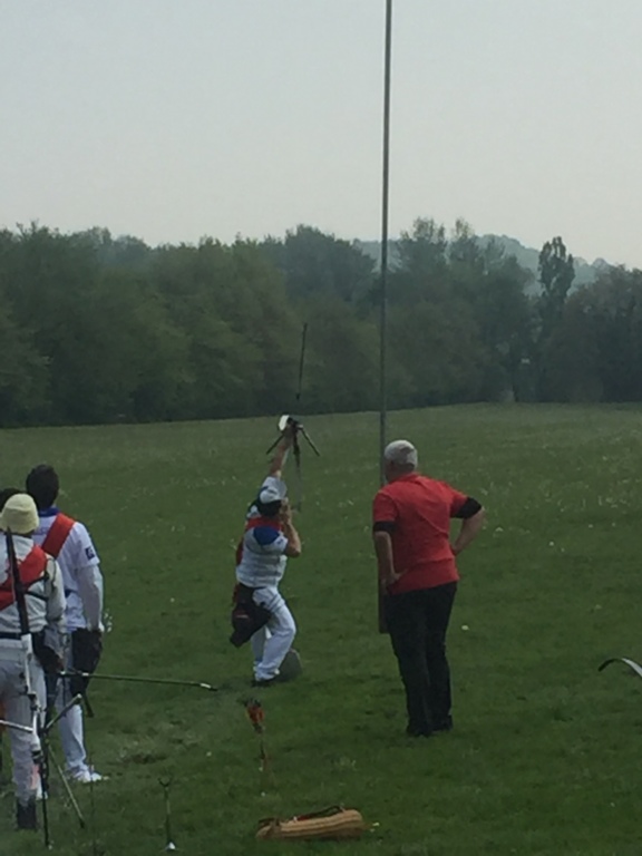 Une fois la brume levée et le soleil apparu, vers 14h, le tir du Roi de France commençait et c'est Stéphane qui représentait la compagnie. Le tir ne dura pas longtemps (4 flèche), car rapidement 6 tireurs se qualifièrent pour la finale. Mais notons que si Stéphane ne tira que 4 flèches, il toucha 2 fois l'oiseau.